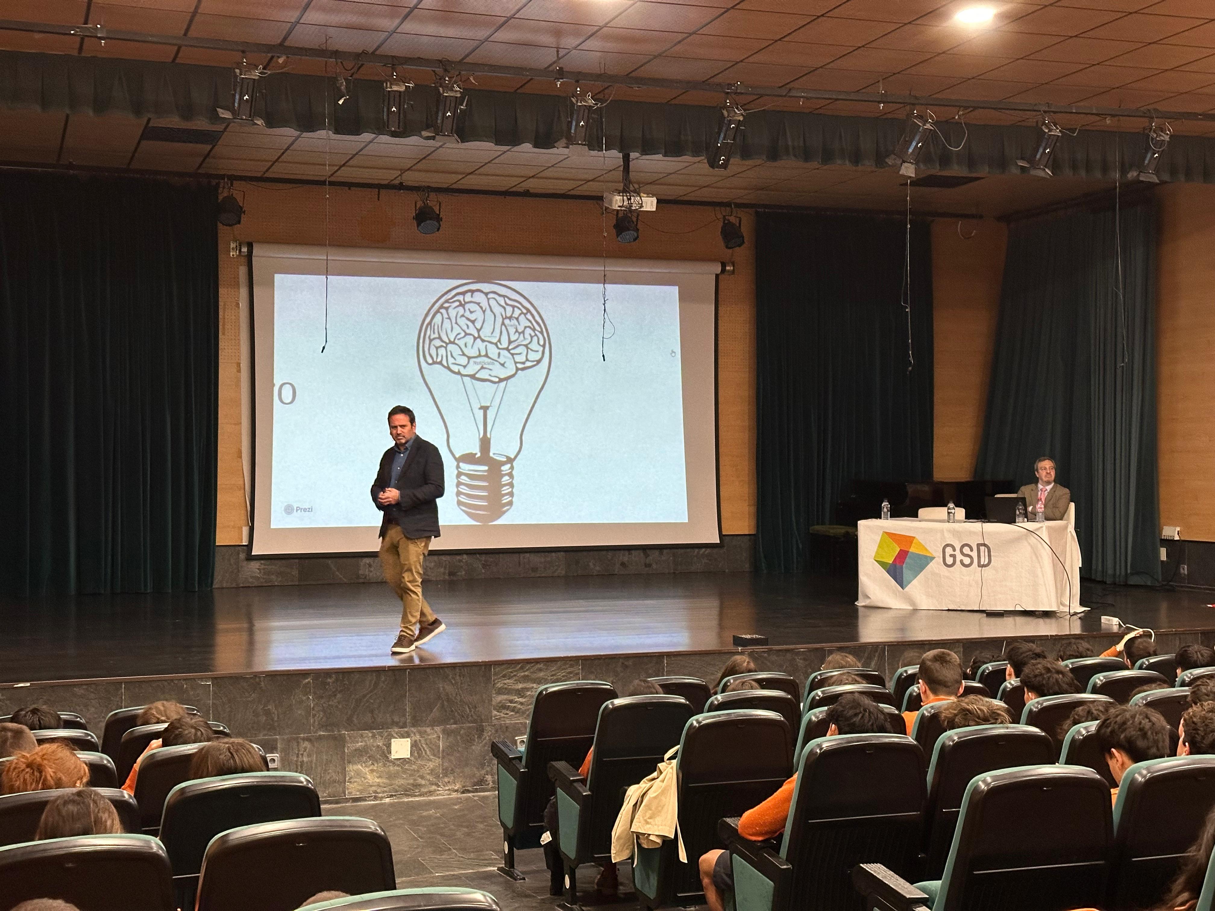 El pasado 12 de febrero el prestigioso neuropsicólogo, colaborador de GSD, trasladó a los alumnos algunas claves importantes del funcionamiento del cerebro que son muy útiles para el autoconocimiento y la toma de decisiones. Durante el encuentro con los mayores de secundaria, Álvaro Bilbao les habló de la importancia del sueño, la alimentación y los buenos hábitos. Expuso de forma clara los graves efectos que tienen en el cerebro las diferentes  sustancias tóxicas. Por último, Álvaro Bilbao se detuvo en aspectos que tienen que ver con la organización y la planificación del estudio eficaz.