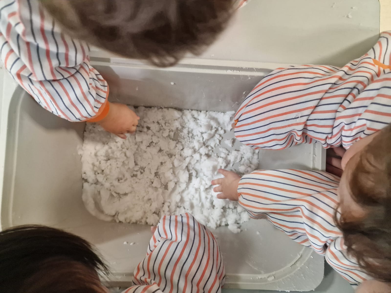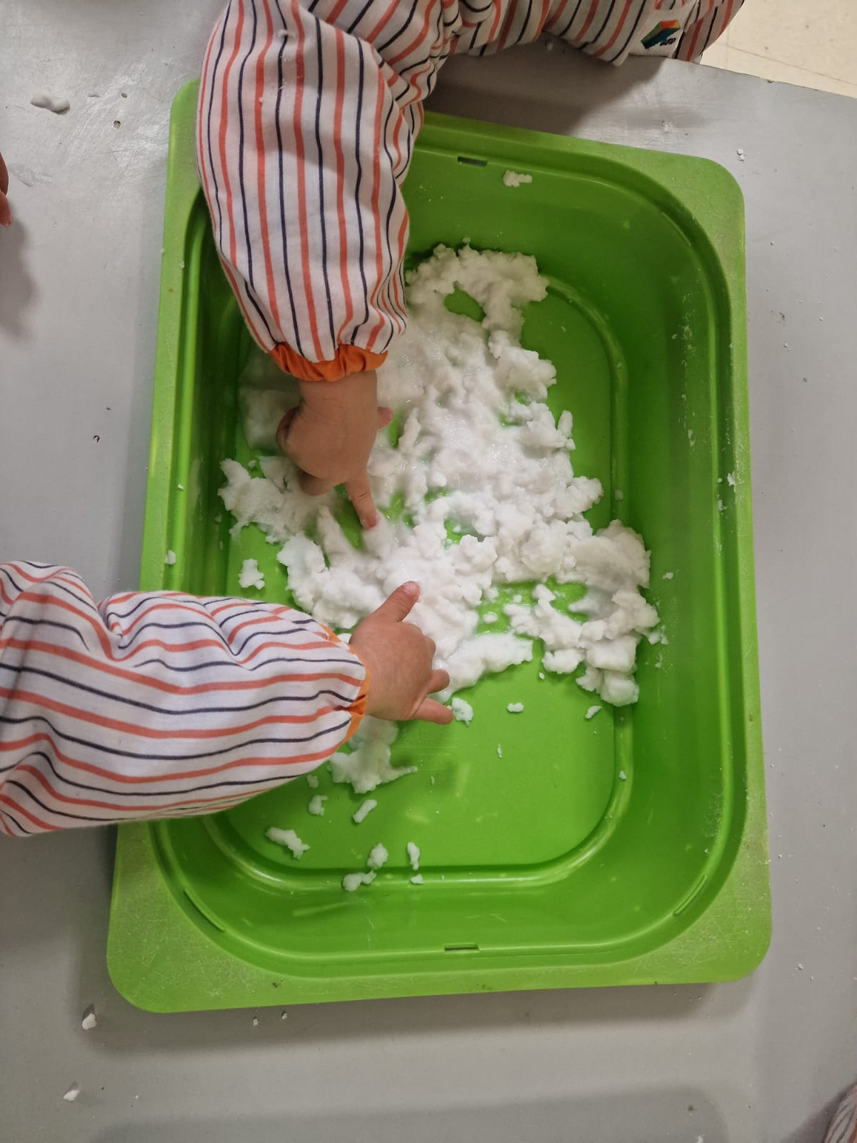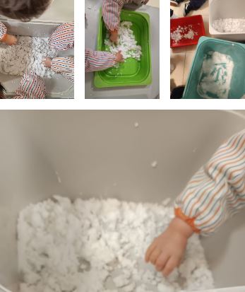 Hoy nuestros peques de nivel 1 se han llevado una gran sorpresa: ¡ha llegado la nieve al aula! Con sus manitas han tocado esta nieve casera fresquita, explorando nuevas sensaciones y jugando con su suave textura. Con esos deditos tan curiosos han intentado crear sus propios muñequitos de nieve y, con un poquito de ayuda de las profes, han salido figuras de lo más divertidas. ¡Ha sido pura magia en sus manos!