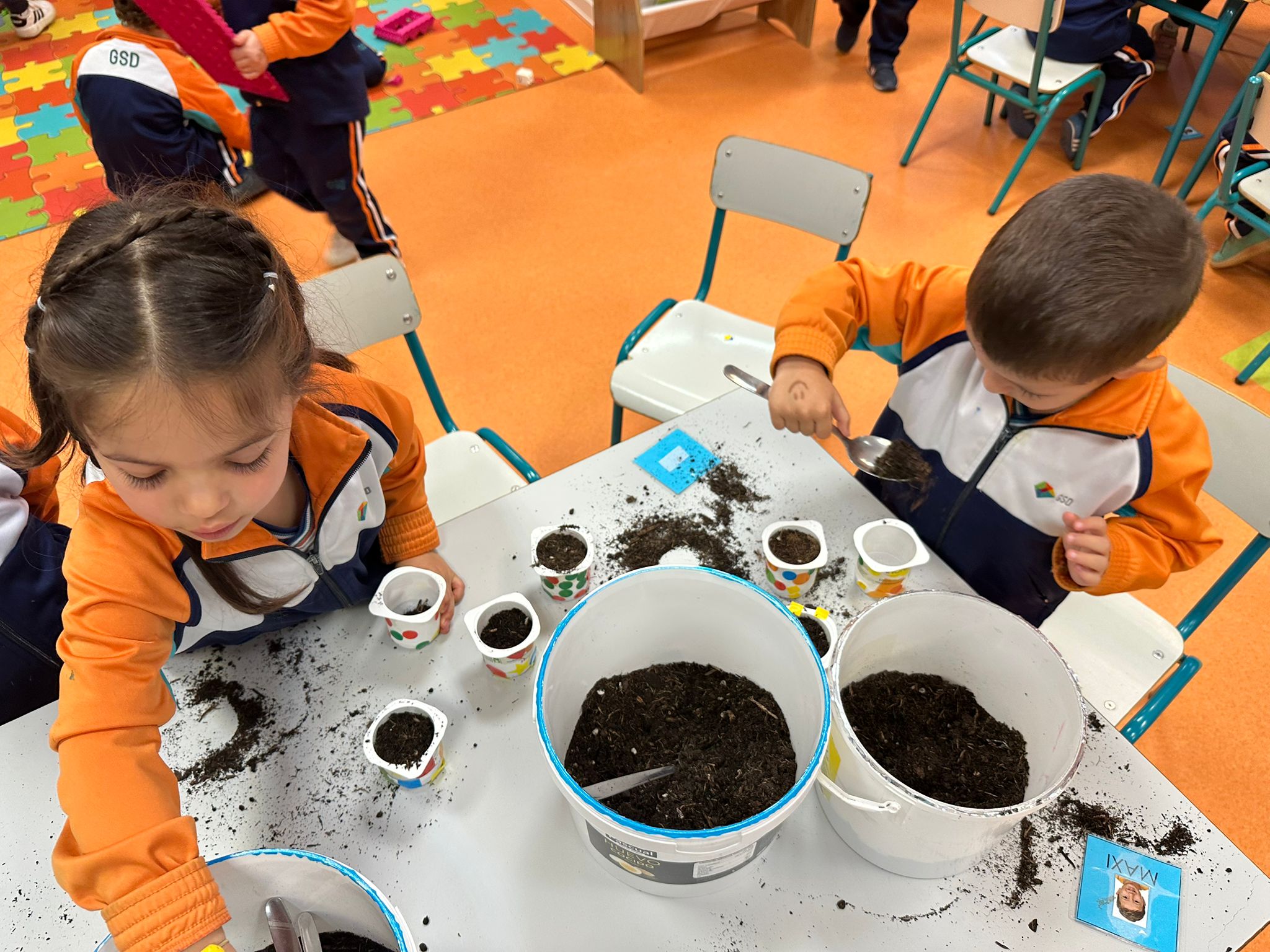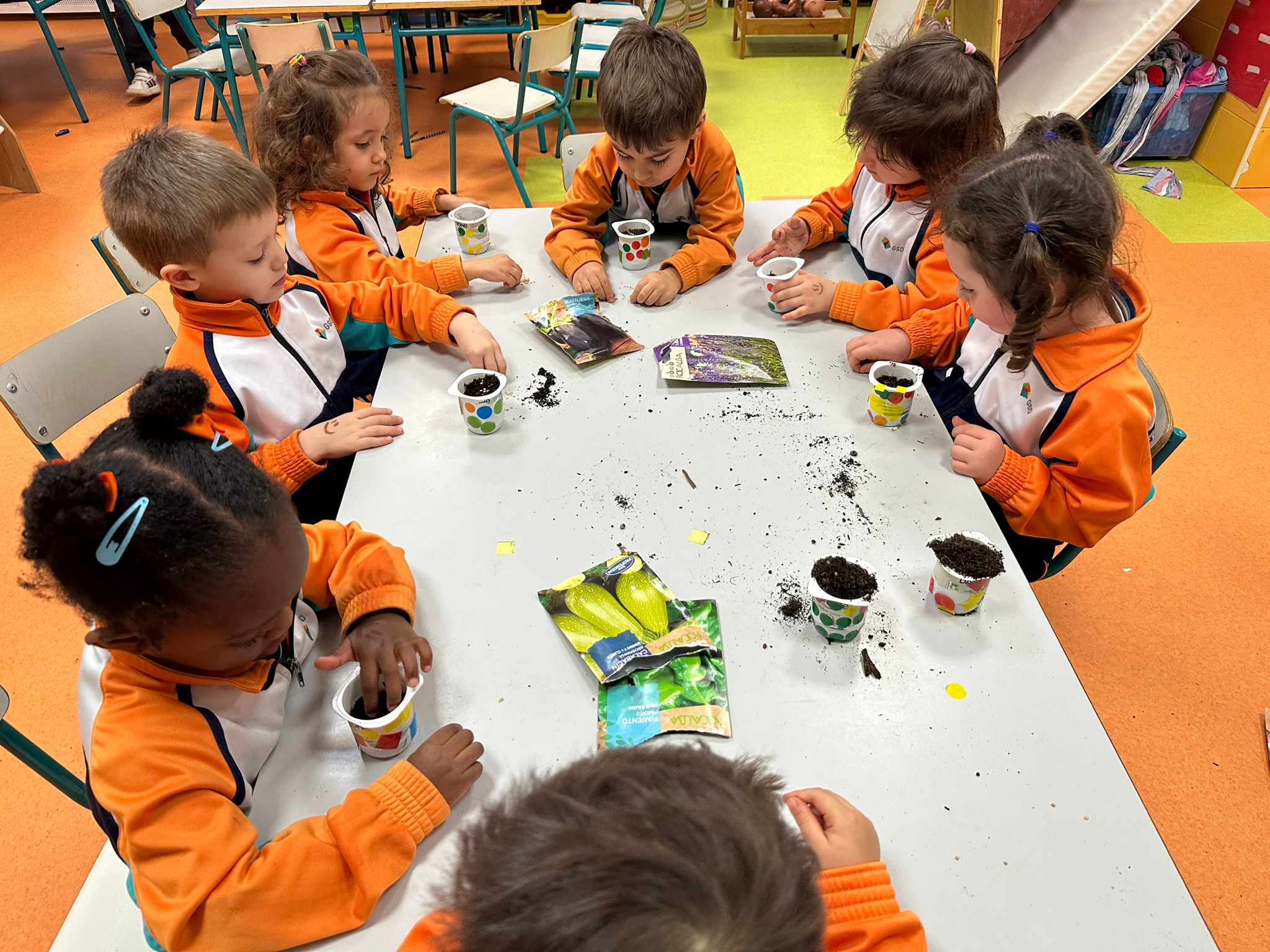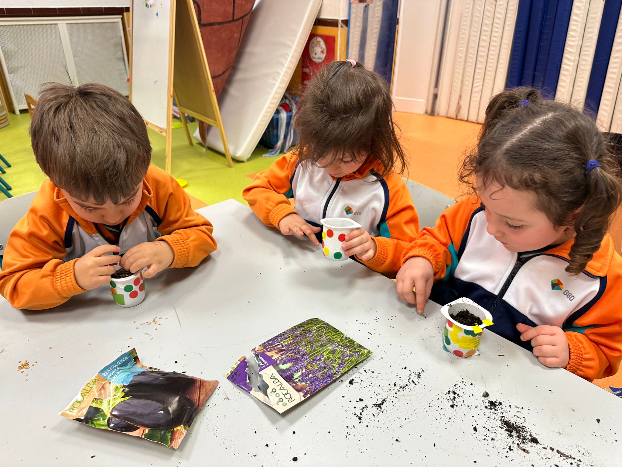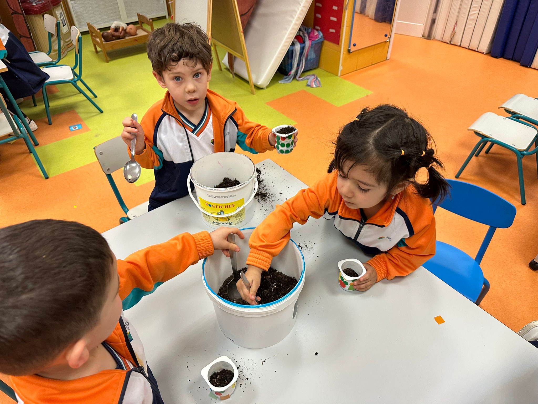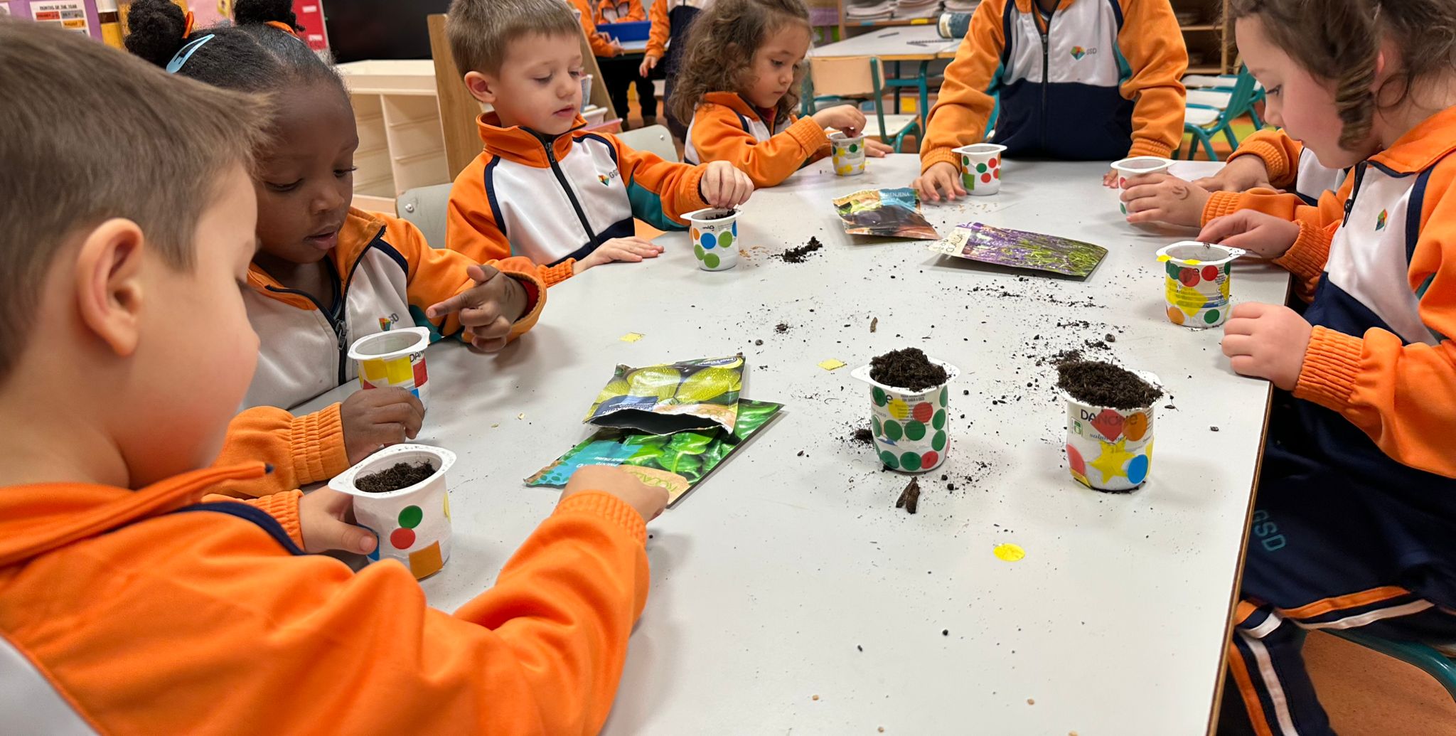 Hemos reutilizado envases de yogur para darles una segunda vida, los hemos decorado con mucha creatividad y después los hemos preparado con mantillo para que nuestras semillas puedan crecer fuertes y sanas.