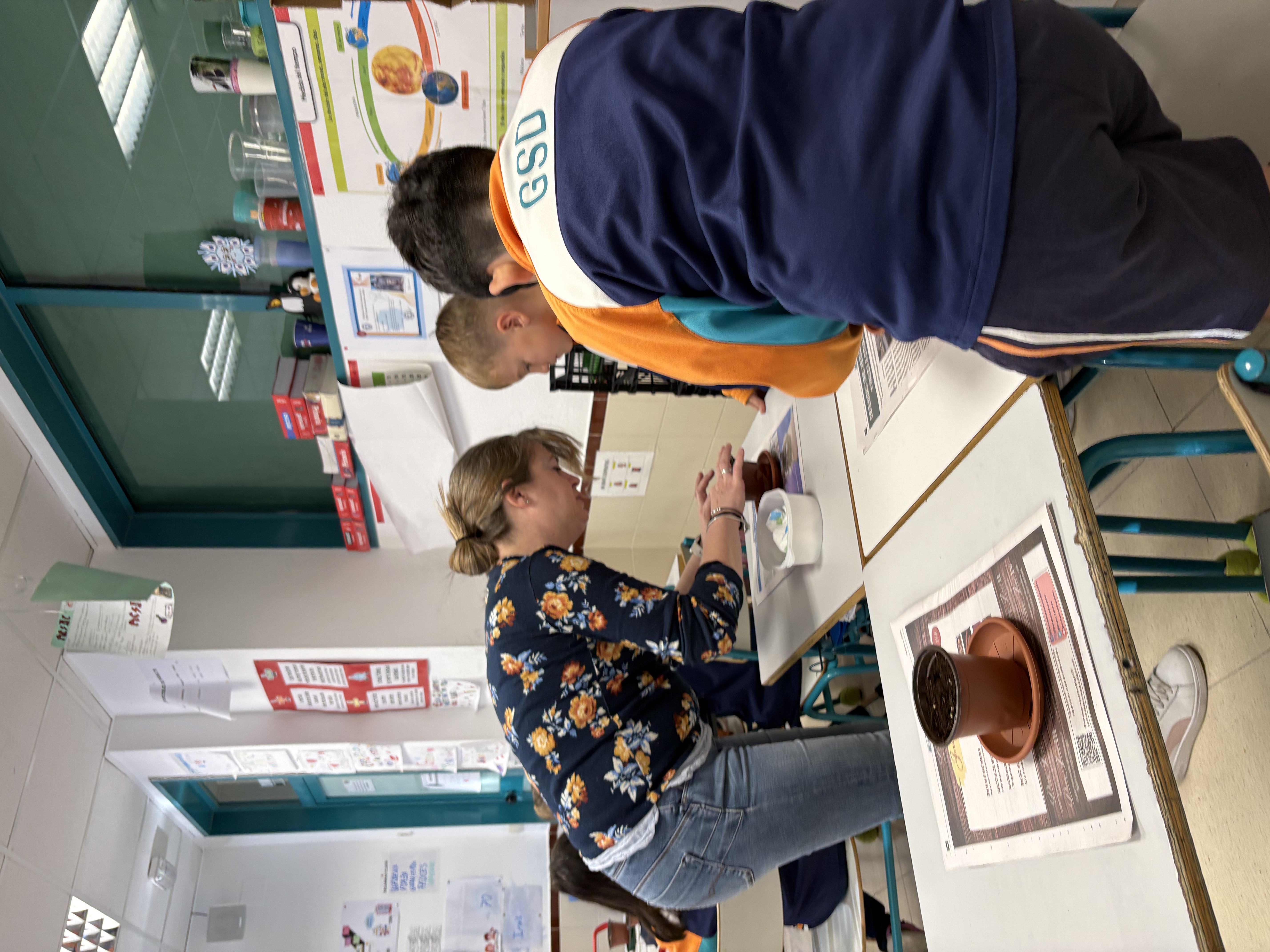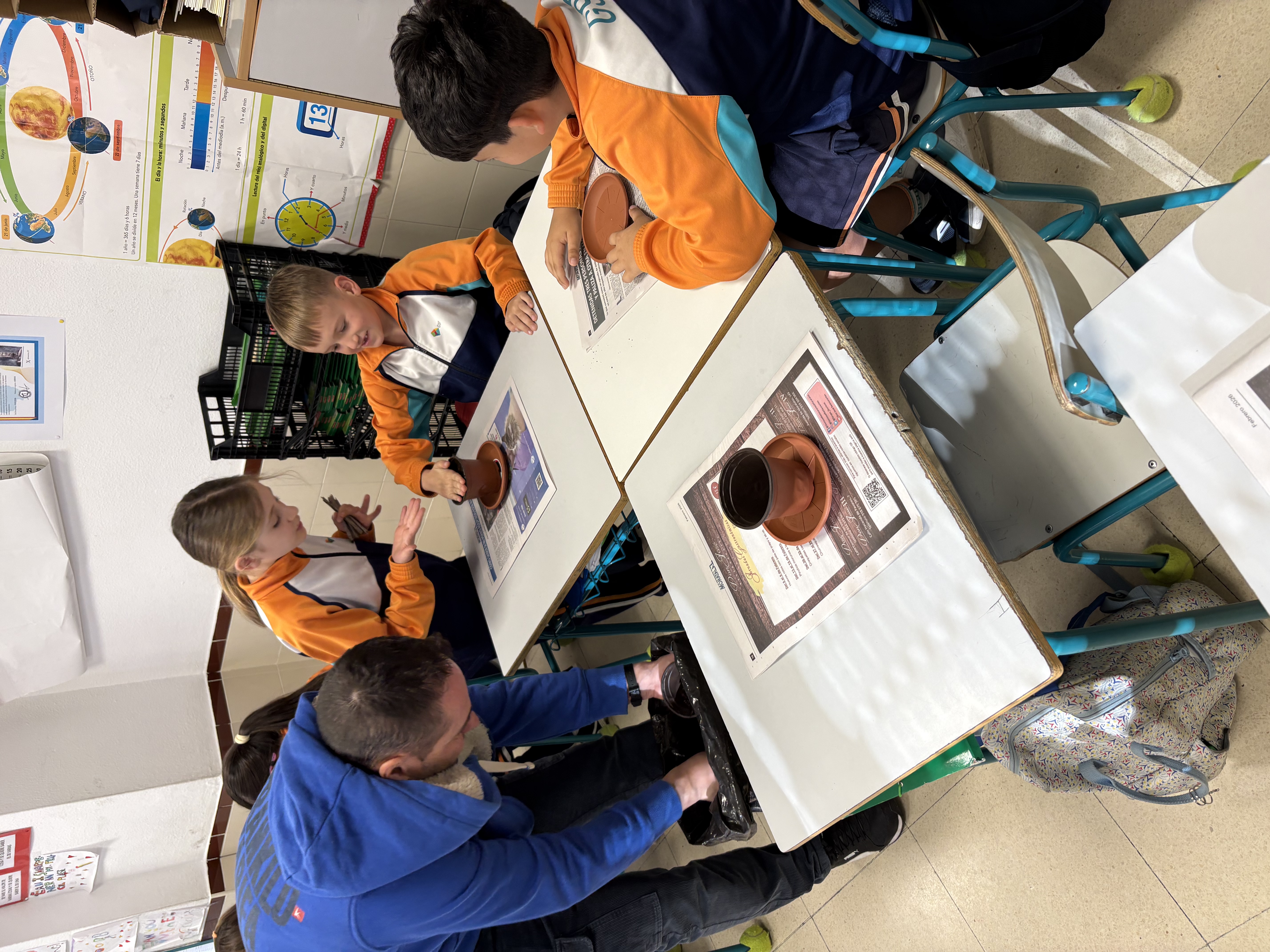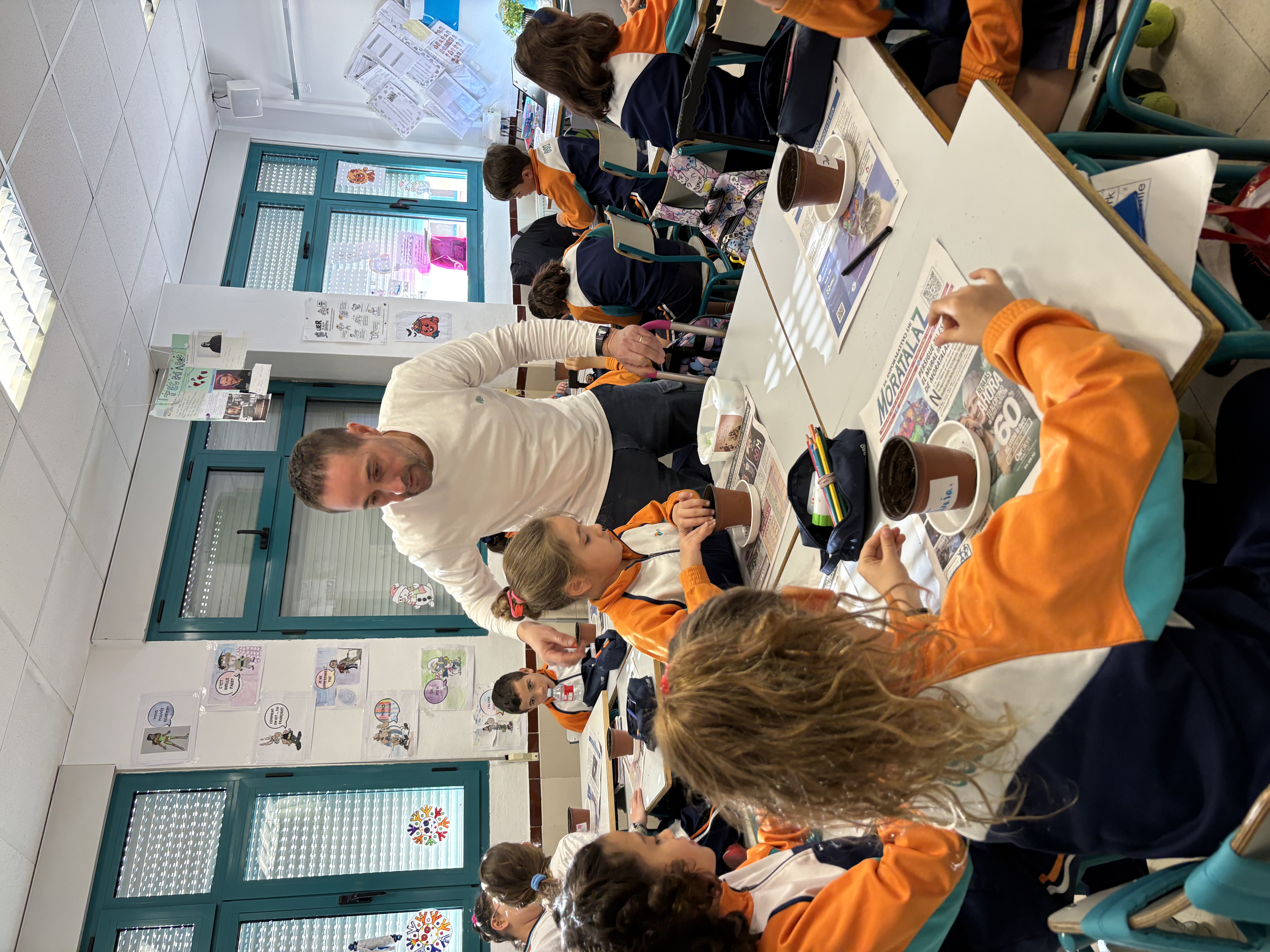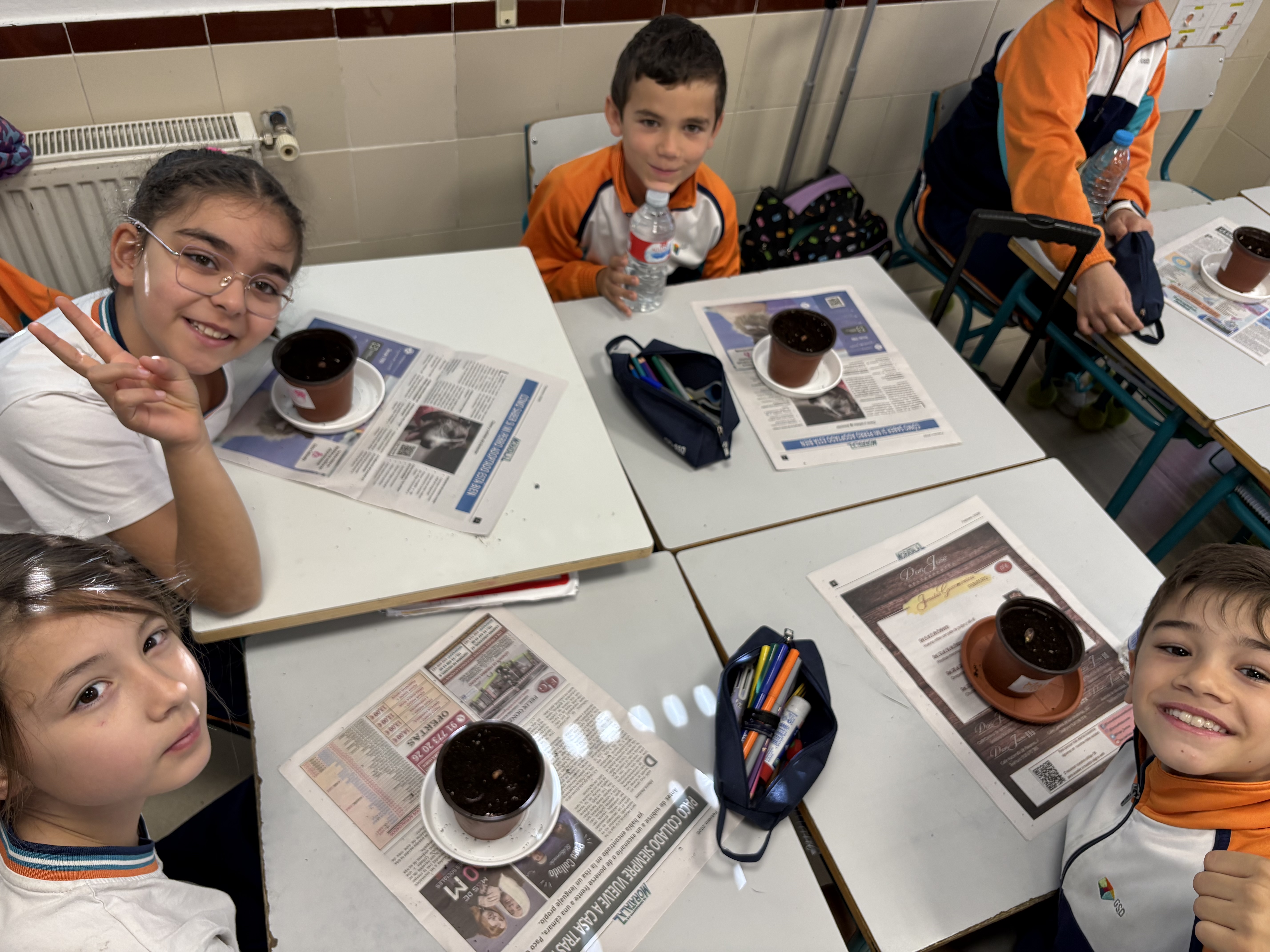 Después, nos han explicado de manera muy clara cómo es el proceso de plantación de un piñón. Primero han contado que tuvieron que abrir varios piñones y humedecerlos para activar la germinación. Una vez que los piñones comenzaron a germinar, los han traído a clase ya preparados, junto con sus macetas, platos y tierra, para que cada alumno y alumna pudiera tener el suyo propio.